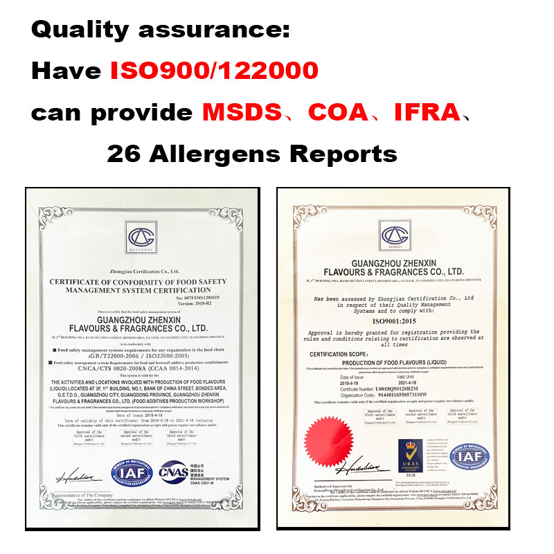 광저우 젠신 맛과 향수 회사는 14년 넘게 향수와 향수 제조에 집중해 왔습니다. 우리는 ISO9001, ISO22000, 그리고 HALAL 인증서를 받았습니다.우리는 COA, MSDS, IFRA, 그리고 알레르기 항원 보고서를 제공할 수 있습니다.