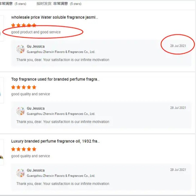 * 우리 회사의 제품 품질은 세계 4대 향료 회사의 품질과 일치합니다. 우리 회사는 중국 향료 회사 중에서 매우 경쟁력이 있습니다. 일반 향료 및 향수 외에도, 당사의 모방 향 기술도 크게 인정받고 있으며, 모방 향의 수도 가장 완벽합니다. 당사 제품은 100개 이상의 국가에 판매되었습니다.